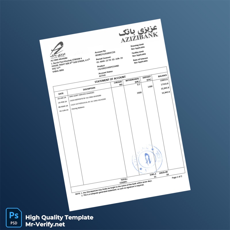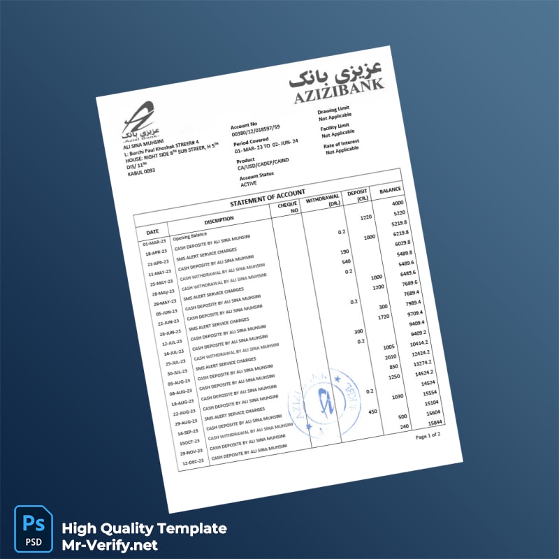 Afghanistan Azizi Bank Statement Template in Word and PDF Formats