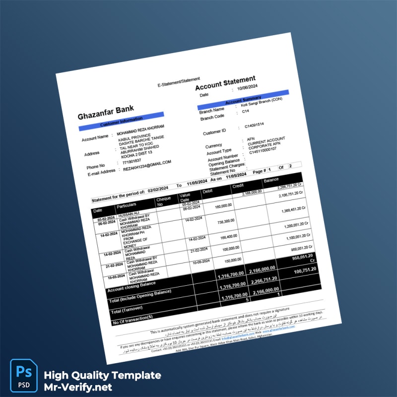 Afghanistan Ghazanfar Bank Account Statement Template in Word and PDF formats 2 page