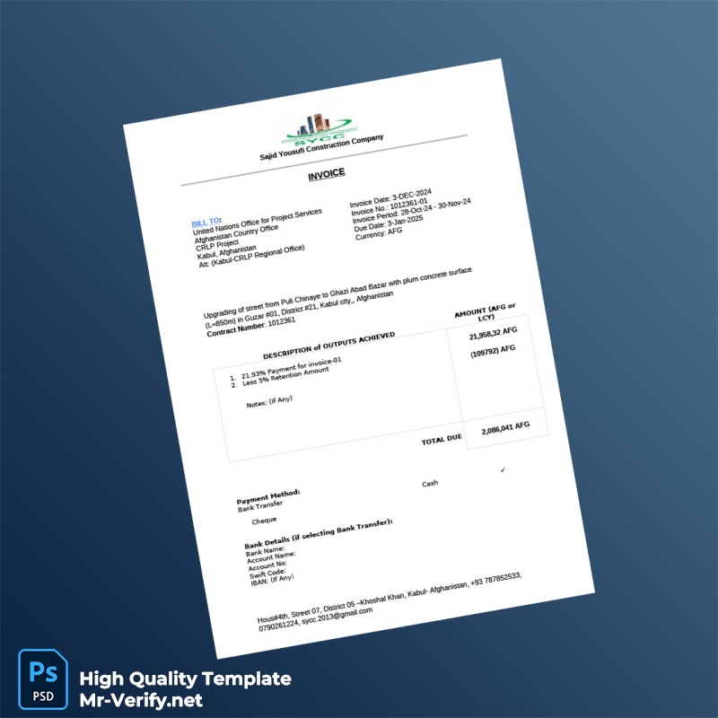 Afghanistan United Nations Office for Project Services Invoice Template: Simplify Your Billing Process