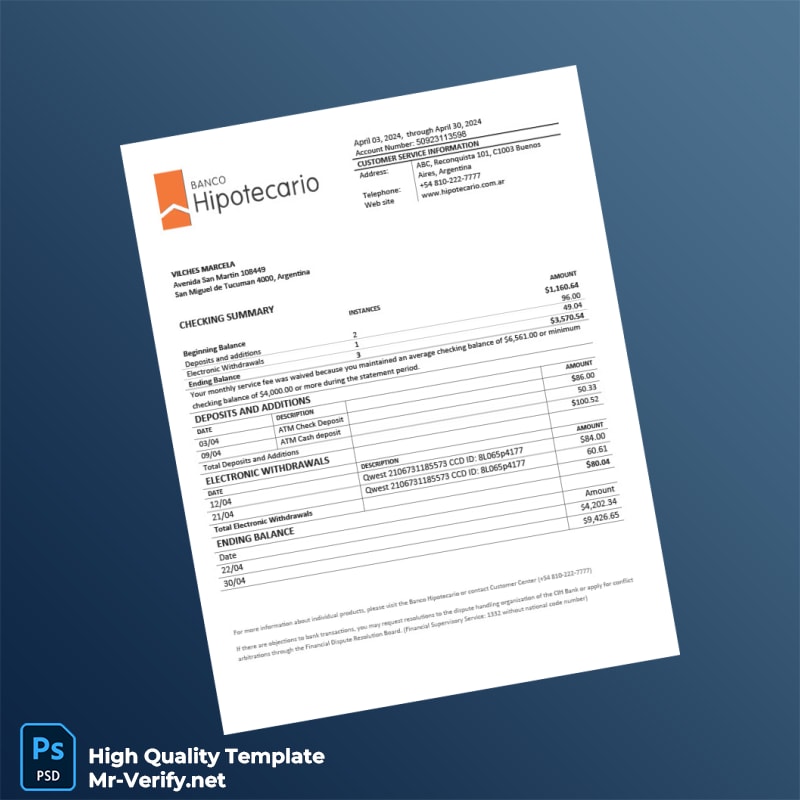 Don’t let missing bank statements slow you down. Invest in our Argentina Banco Hipotecario Bank Statement Template today and experience the ease of having your essential documents ready at your fingertips. Click here to explore more options and see how we can help you meet your documentation needs with unmatched convenience!