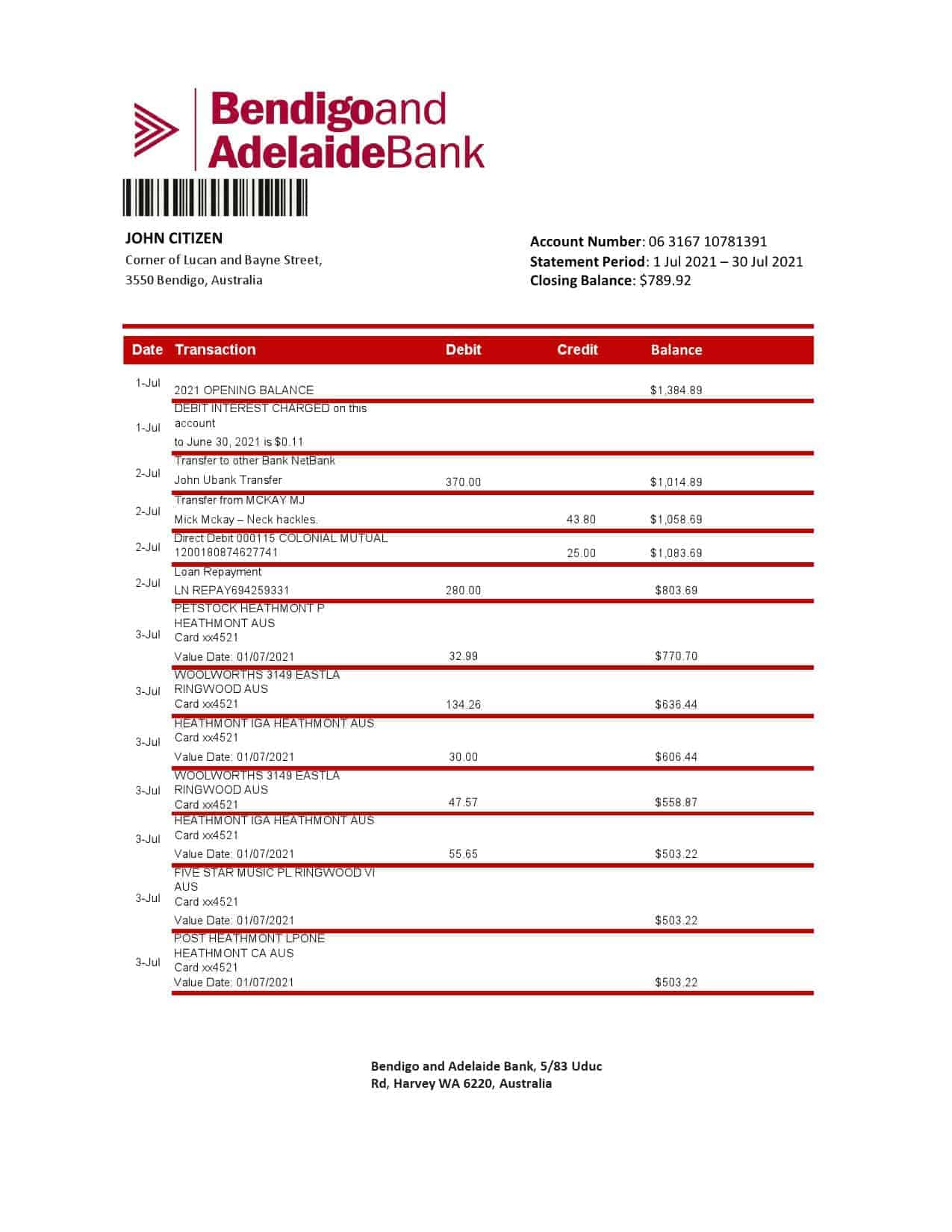 Upon purchase, enjoy instant file download, which includes the Australia Bendigo and Adelaide Bank statement .doc file and fonts.