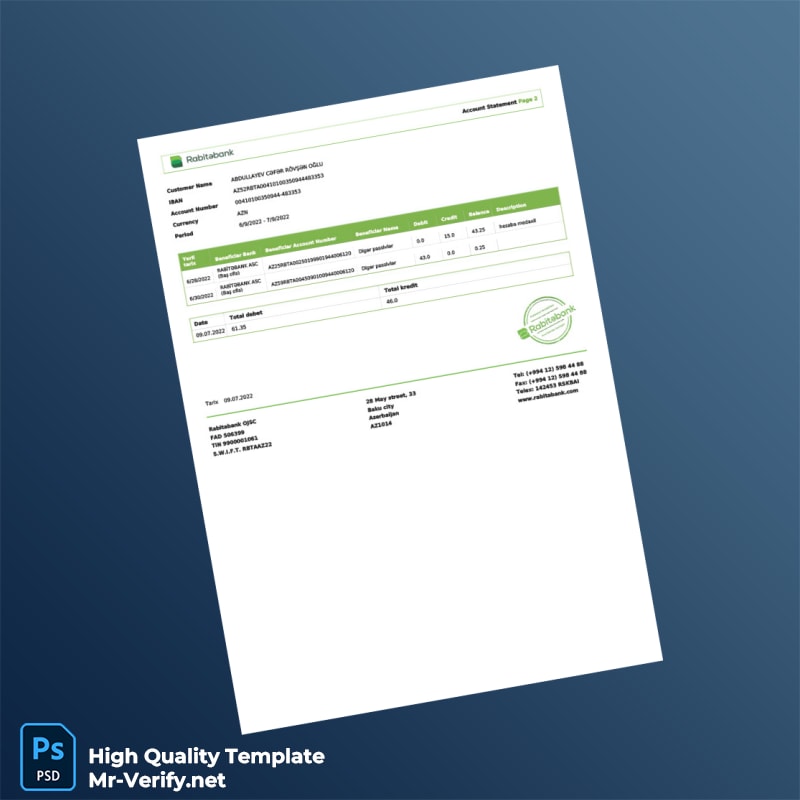 Azerbaijan Rabitabank Bank Statement Template in Word and PDF formats 2 page
