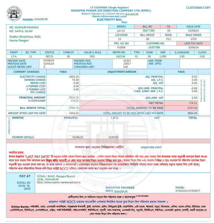 Bangladesh Dhaka Power Distribution Company Editable Utility Bill Template