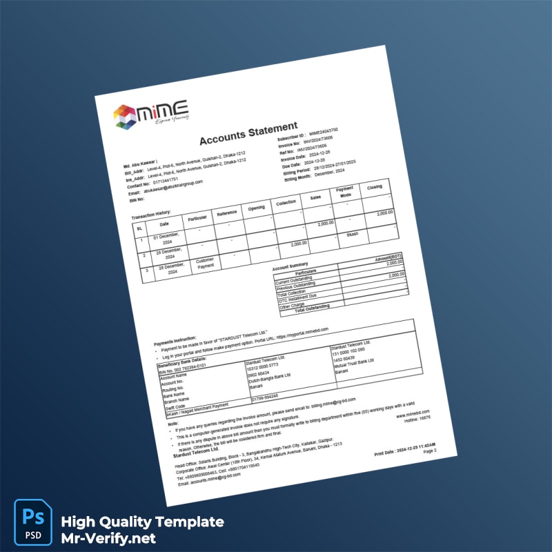 The Bangladesh Stardust Telecom Ltd Invoice Template offers a seamless and professional invoicing solution designed specifically for telecom and service providers. Available in both Word and PDF formats, this editable invoice template caters to busy professionals who need quick, customizable, and print-ready invoices that comply with business standards.