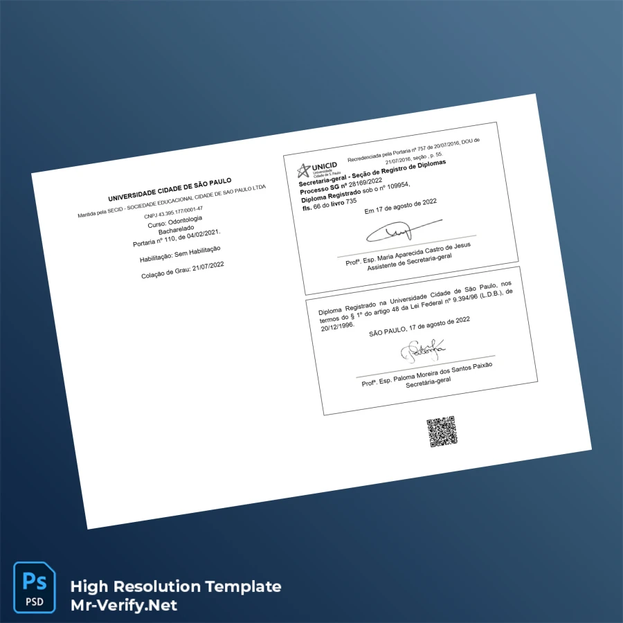This diploma template boasts a detailed and authentic design tailored for dental degrees from the Brazil University Cidade de São Paulo. With a resolution optimized for professional printing, every element—from seals to signatures—is crisp and clear. The file structure utilizes layered components, making it simple to personalize without compromising the background layout. The package includes compatible fonts to mirror the official document’s style accurately, and users receive instant file download upon payment confirmation for immediate use.