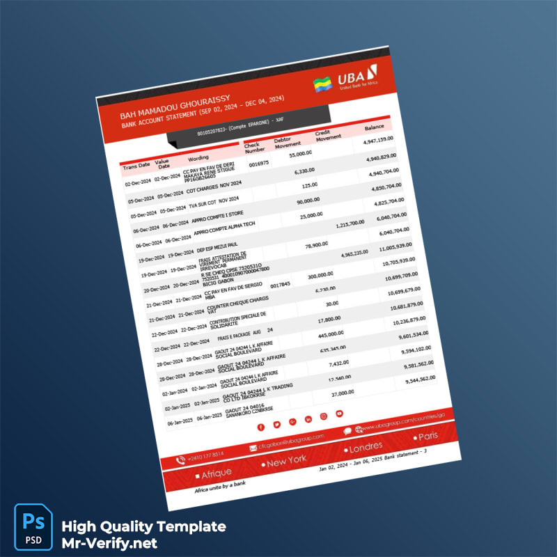 Struggling with your bank statement presentation? Unveil the solution with our professionally crafted Cameroon UBA Bank Statement Template. Designed for convenience and accuracy, this fully editable bank statement template is your go-to resource, whether you need a quick replacement or a reliable format for valid documentation.