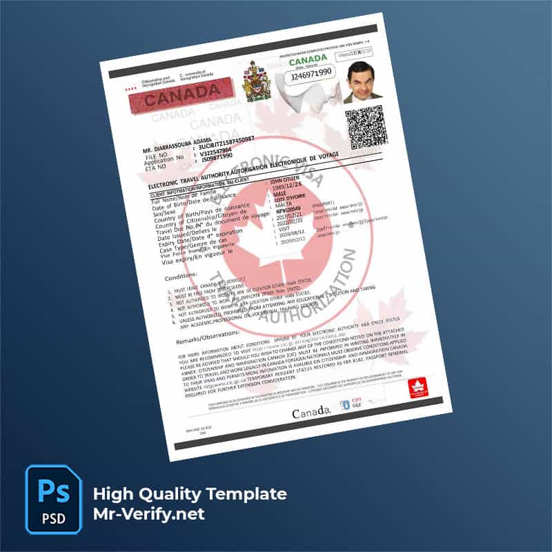 This Canada eVisa Word and PDF Template from mr-verify.net delivers unmatched flexibility, detailed formatting, and a professional appearance for digital simulations, designs, and official-style document presentations.