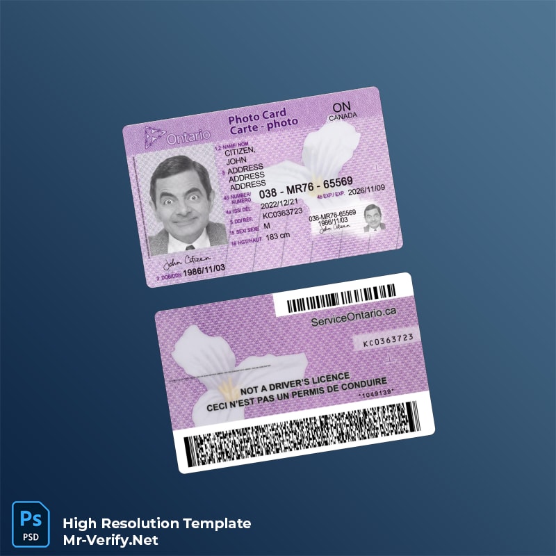 This high-quality, layered PSD Photoshop template is designed specifically for creating authentic Canada Ontario Photo cards. With a resolution optimized for professional printing, this fully editable ID card template features organized layers for seamless customization of personal information, photos, and security elements. Compatible with the latest Adobe Photoshop versions, it facilitates quick and precise edits while preserving intricate design details.