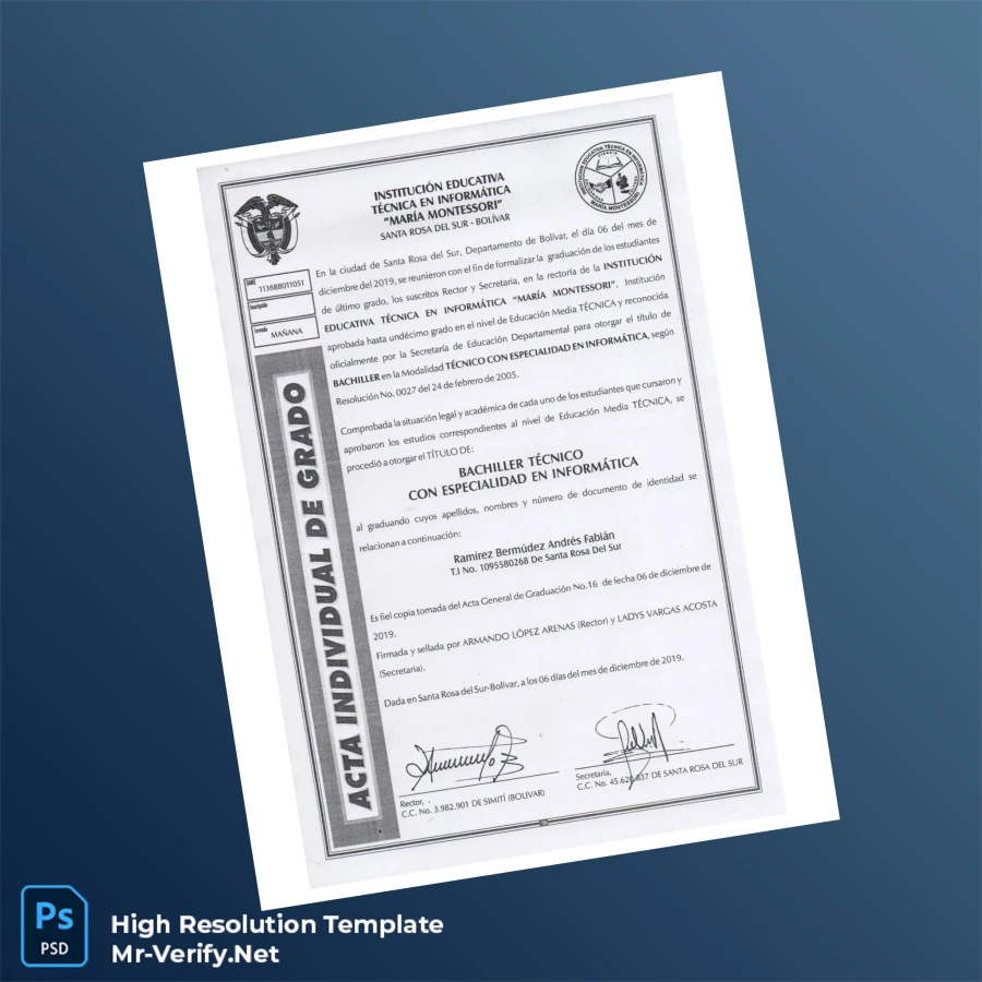 Discover the Colombia Institution Educativa Técnica en Informática Marta Montessori Technical Bachelor Certificate, an expertly crafted high-resolution editable diploma template designed for professionals seeking a reliable and customizable solution for diploma replacement or presentation. This printable certificate template is provided in layered Word and PDF formats, ensuring compatibility across various editing software and effortless personalization. The package includes all necessary fonts and graphical elements, allowing you to modify key details such as names, dates, and institution-specific content with precision and without compromising the design integrity.
