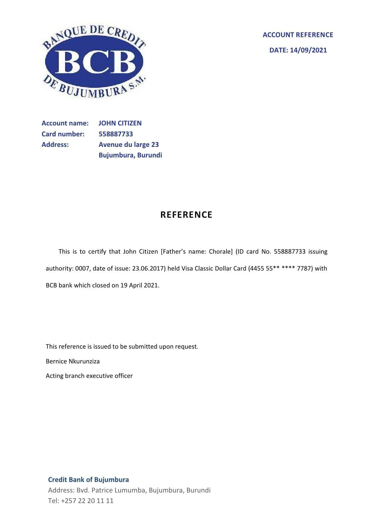 Download Burundi Credit Bank of Bujumbura Bank Reference Letter Templates | Editable Word