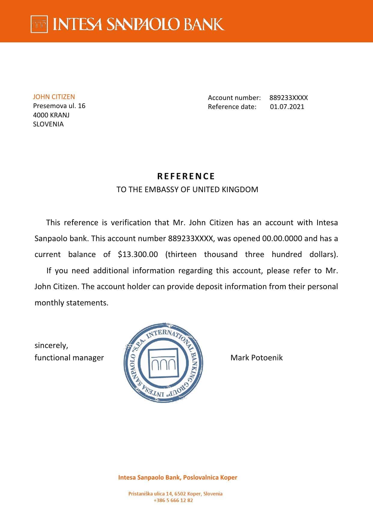 Download Slovenia Intesa Sanpaolo Bank Reference Letter Templates | Editable Word