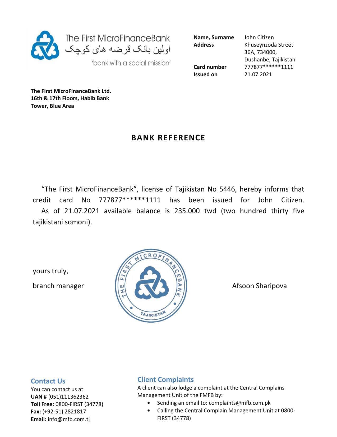 Benefits of Using Editable Tajikistan The First MicroFinanceBank Bank Reference Letter