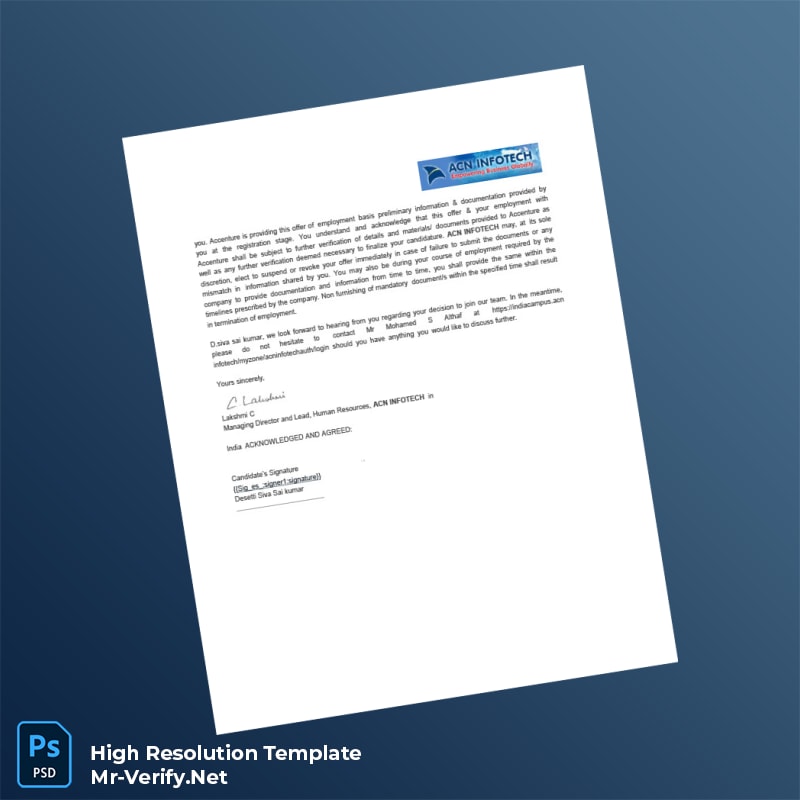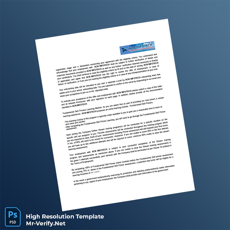 Designed for those who often need to provide employment proof but face tight deadlines, the Acn Infotech template addresses common challenges such as document loss, expiration, or last-minute verification demands. It empowers users to maintain compliance and professionalism with minimal effort and maximum efficiency.