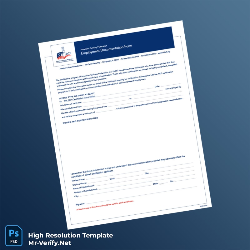 Ensure seamless verification of employment with the American Culinary Federation Employment Verification Letter Word and PDF Template, a meticulously designed editable document that meets professional standards. This template offers a hassle-free solution for culinary professionals and HR departments needing quick, reliable proof of employment.