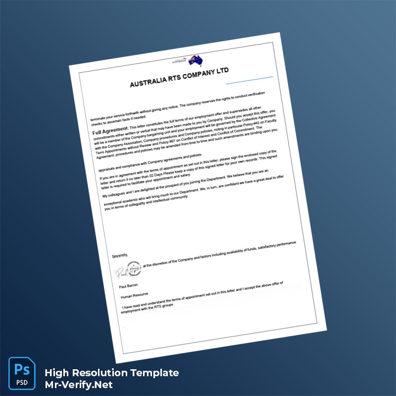 The Australia RTS Company Ltd Employment Verification Letter Word and PDF Template is meticulously designed to simplify your administrative tasks with a professional and easily customizable document. Whether you are an HR professional, a recruiter, or an individual needing a formal proof of employment, this template offers a seamless solution to certify job status quickly and accurately.