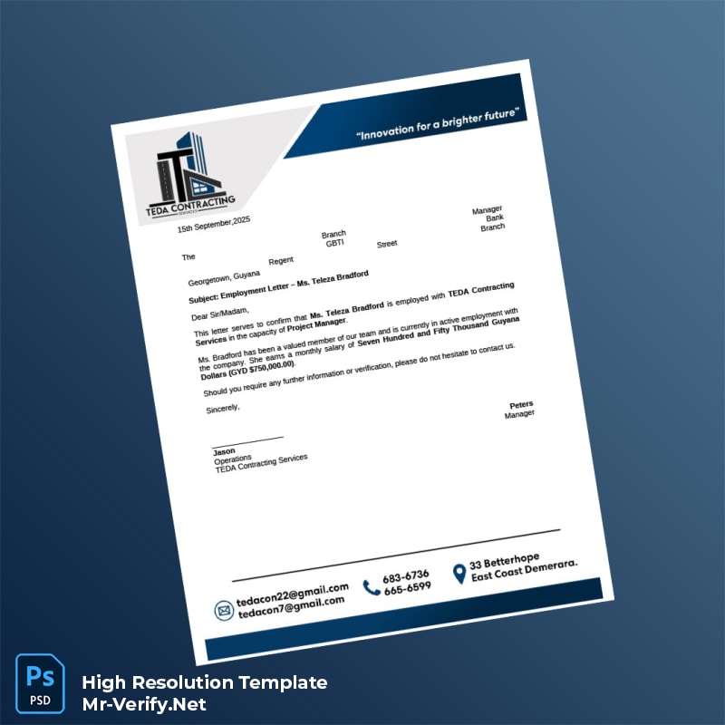 Don’t let administrative hurdles hold back your career or business operations. Equip yourself with the Guyana TEDA Contracting Services Employment Verification Letter Word and PDF Template and experience streamlined document preparation that matches your professional standards. Invest in this invaluable resource now and take the first step toward hassle-free employment verification.