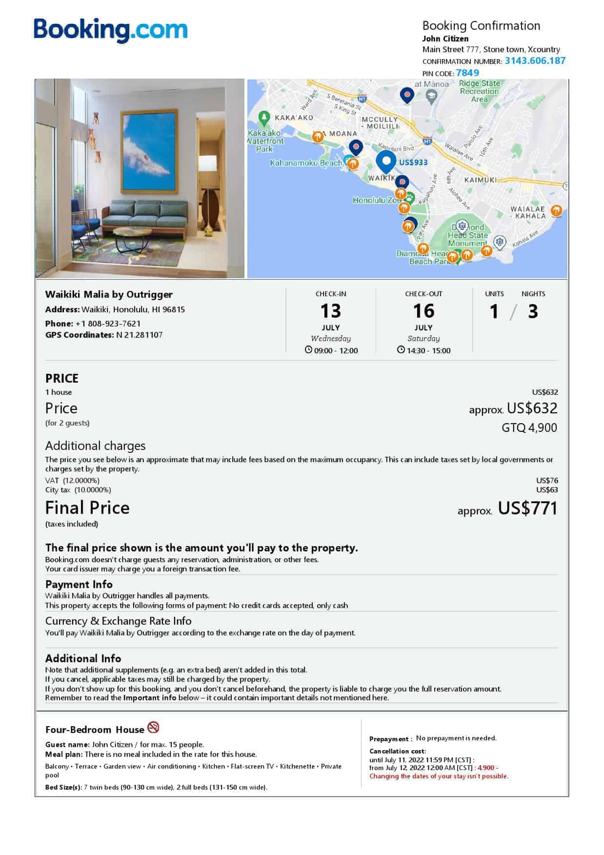 Are you in need of a hotel or Airbnb booking confirmation for your needs? Look no further! Mr. Verify’s editable templates are perfect for providing proof of accommodation and showing expenses, making the fake booking process even more authentic and reliable. Our templates come in both Word and PDF formats, and are available for almost all countries. With our Hawaii country name fillable booking form templates, you can easily customize your booking confirmation to fit your specific needs, saving you time and hassle. And if you need any help with editing or construction works, our specialists are ready to assist you at affordable prices. Our support team is also available online to answer any questions you may have.