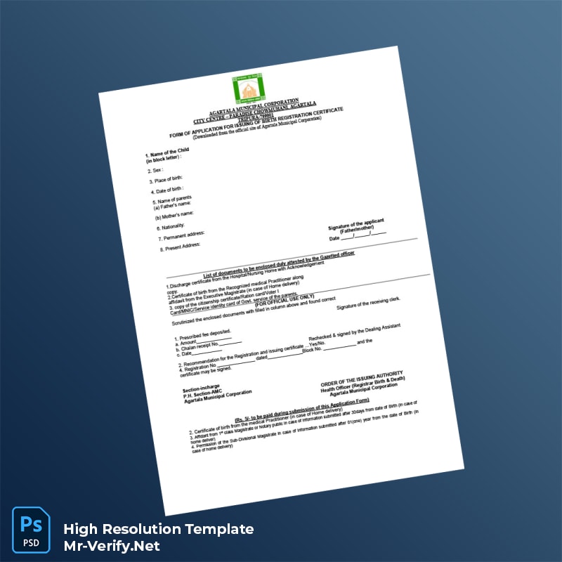 The India Agartala Municipal Corporation Birth Registration Certificate Word and PDF Template is expertly designed for professionals seeking a swift and flawless solution to create official birth registration certificates. Whether you are an administrative officer, legal consultant, or a municipal staff member, this comprehensive certificate template streamlines document preparation by ensuring compliance with local standards while offering complete customization.