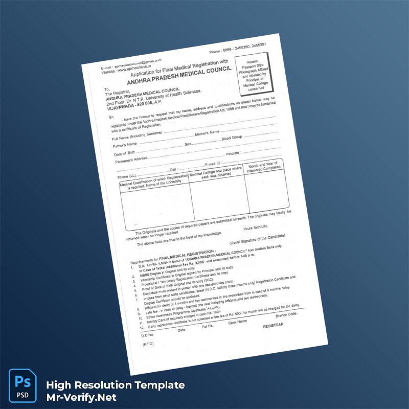 The India Andhra Pradesh Medical Council Application Form for Final Registration Word and PDF Template offers a hassle-free solution for healthcare professionals seeking an efficient and accurate registration process. This editable registration certificate template is meticulously designed to meet all formal requirements, ensuring that your application stands out with clarity and precision.