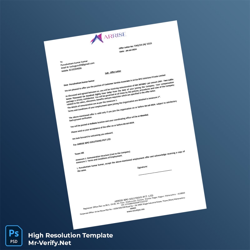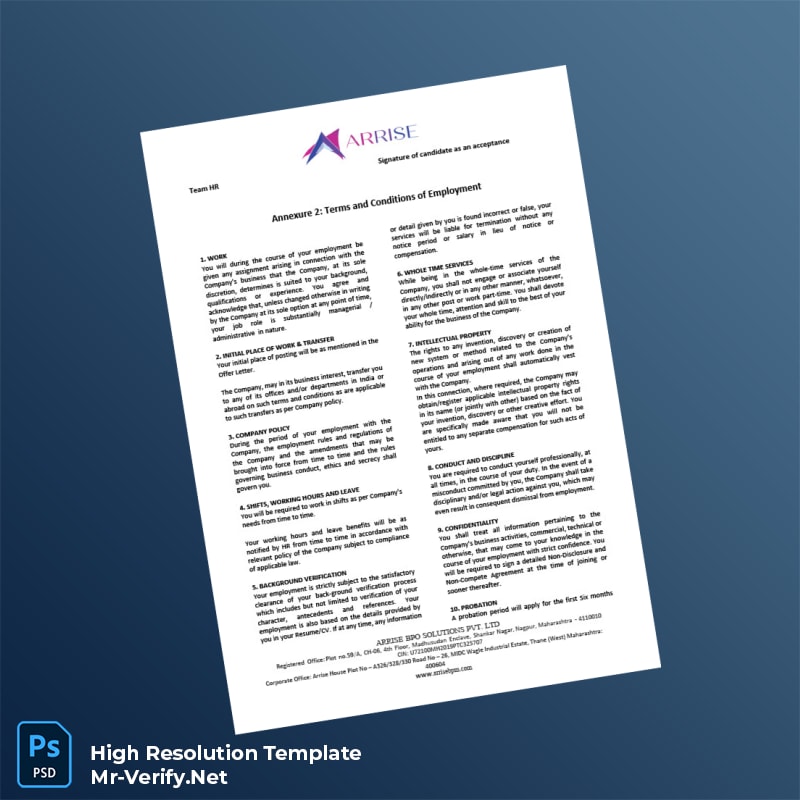 Empower your HR department or agency with this ready-to-use resource. Achieve accuracy, professionalism, and efficiency in every verification letter you issue. Buy the India Arrise BPO Solutions Pvt Ltd Employment Verification Letter Word and PDF Template now and experience seamless employment documentation tailored to your corporate needs.