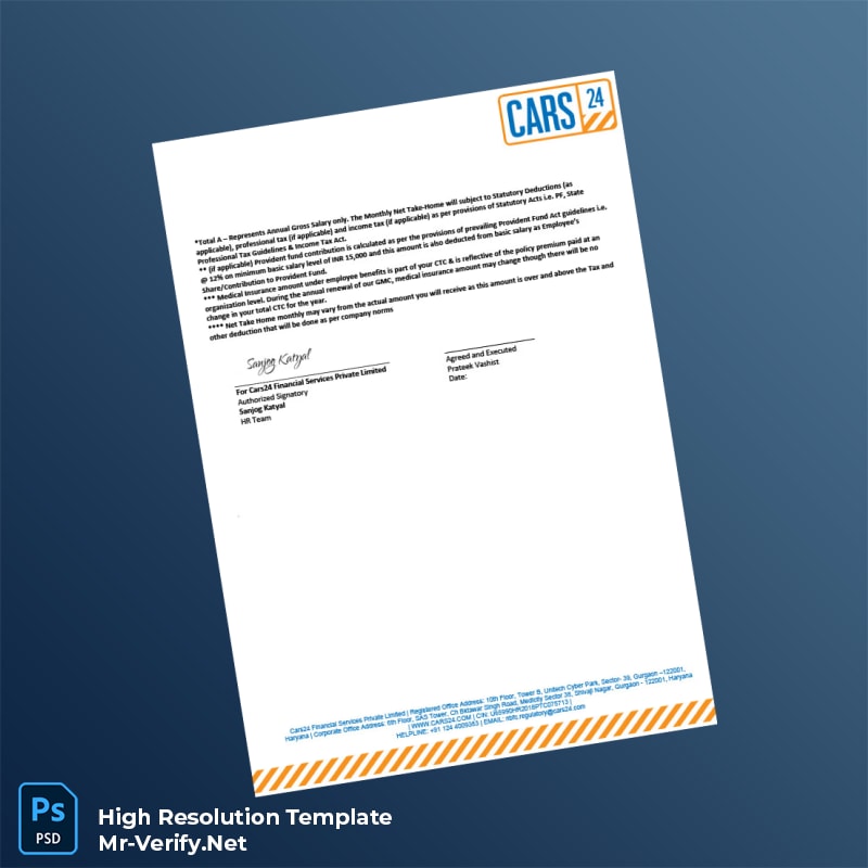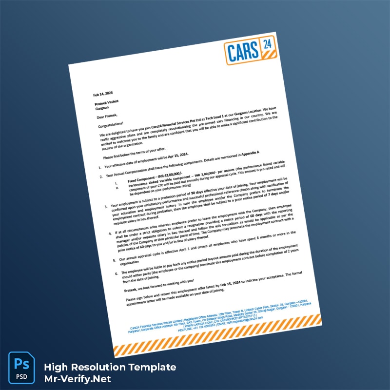Enhance your document authenticity and workflow with our India Cars24 Financial Services Employment Verification Letter Word and PDF Template. Purchase today and experience the convenience of a polished, ready-to-use verification letter that elevates your professional credibility and speeds up administrative processes.