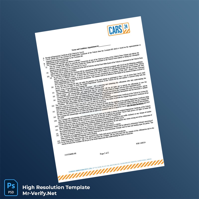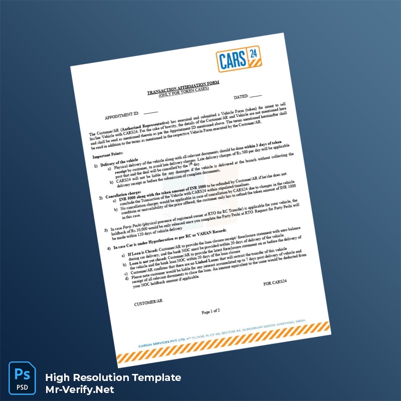 The India CARS24 Transaction Affirmation Form Word and PDF Template offers a seamless solution for professionals needing a reliable and editable document for vehicle sale transactions. This template is designed to simplify the process of affirming transactions, ensuring that all necessary details are clearly presented and professionally formatted, making it an essential tool for vehicle dealers, legal advisors, and individual sellers alike.
