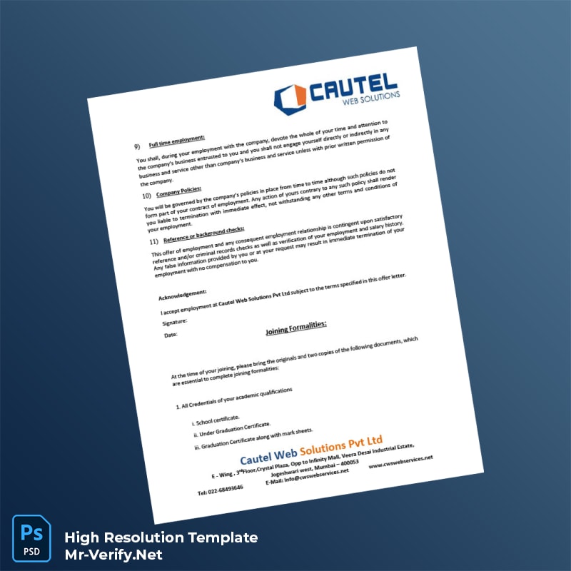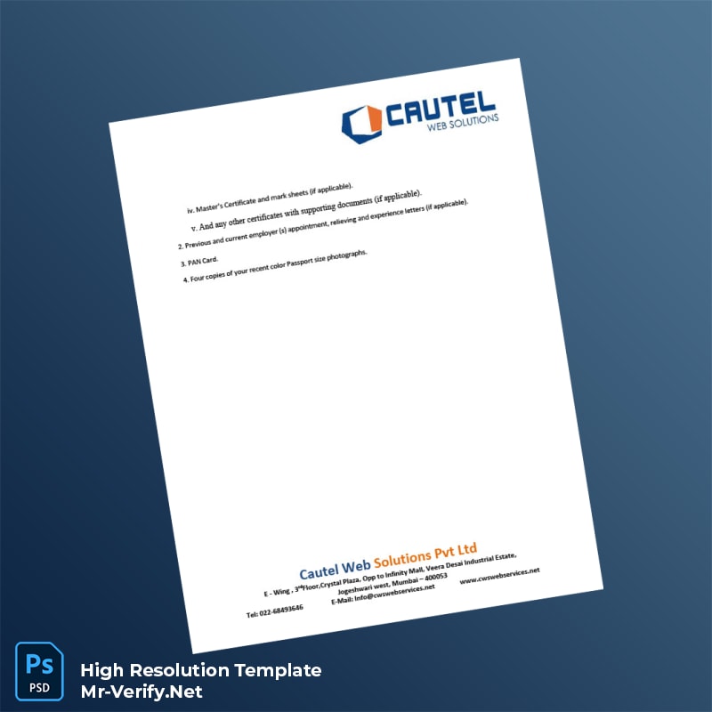 Choose the India Cautel Web Solutions Pvt Ltd Employment Verification Letter Word and PDF Template to bring professionalism, efficiency, and reliability to your employment confirmation process. Purchase now to optimize your HR operations and provide clear employment evidence whenever required.
