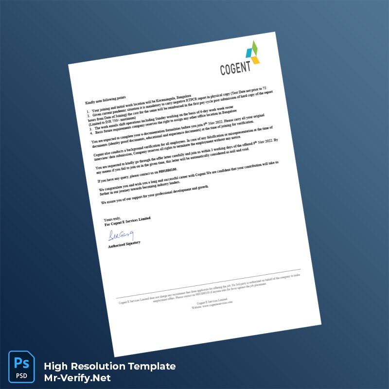 Don’t let administrative bottlenecks delay your operations. Invest in the India Cogent E Services Limited Employment Verification Letter Word and PDF Template to streamline your verification procedures and uphold professional standards with every letter issued. Click to download now and experience the convenience of a ready-to-use, customizable employment verification template that caters to your specific needs.