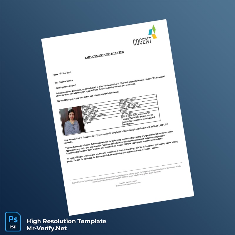 The India Cogent E Services Limited Employment Verification Letter Word and PDF Template offers a seamless solution for HR professionals, recruiters, and administrative staff who require a reliable and editable proof of employment document. Whether you need a certificate of employment template or a job confirmation letter template, this package simplifies your process, ensuring accuracy and professionalism in every communication.