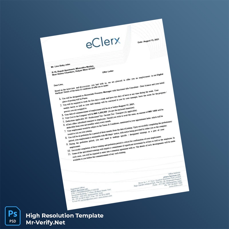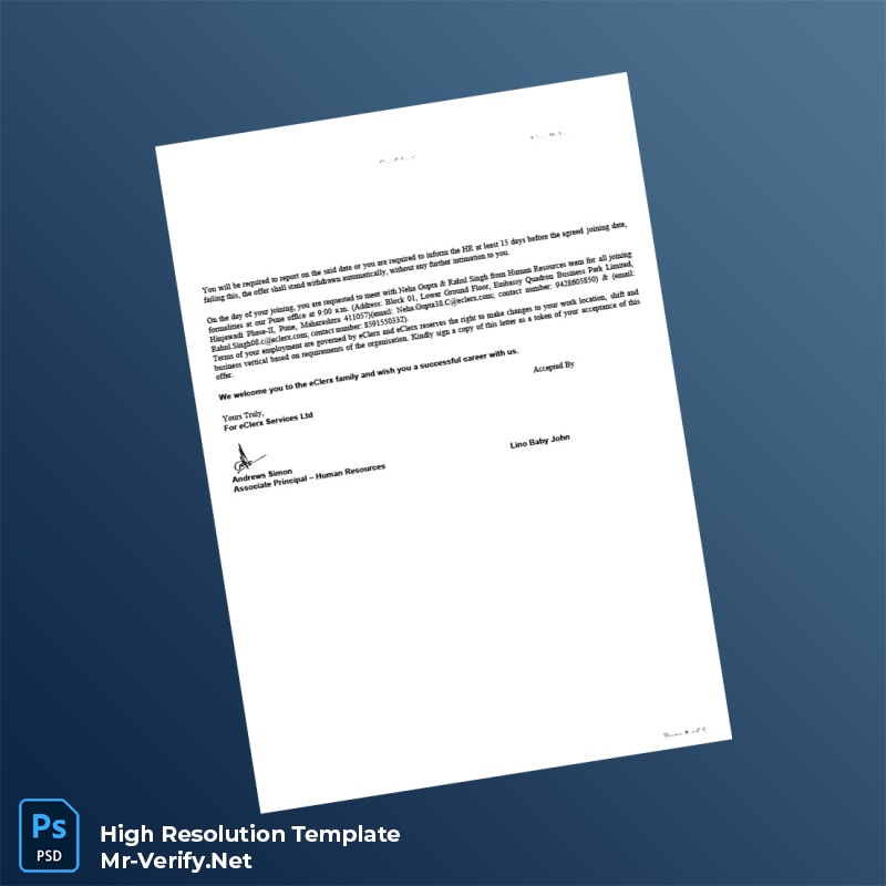 Don’t let document delays compromise your professional engagements. Take advantage of the India eClerx Services Ltd Employment Verification Letter Word and PDF Template to produce precise, credible, and elegant proof of employment. Buy now and elevate your verification processes to a new level of efficiency.