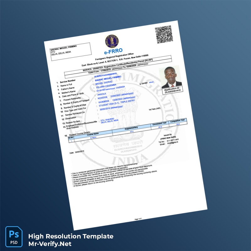 Editable India FRRO Registration Certificate Word and Pdf Template