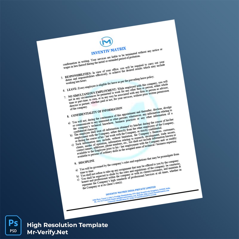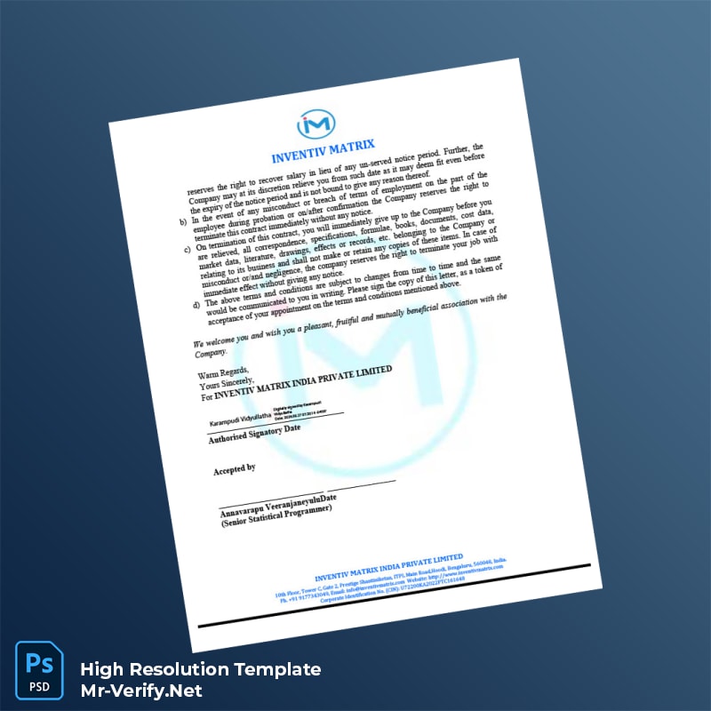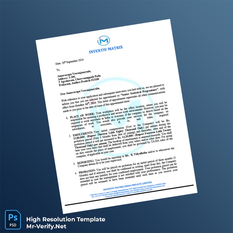 Ensure seamless proof of employment with the India Inventiv Matrix Employment Verification Letter Word and PDF Template, designed specifically for HR professionals, recruiters, and business administrators worldwide. This comprehensive, editable document simplifies providing official confirmation of employment status, enabling quick and accurate responses to verification requests.