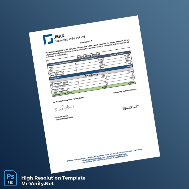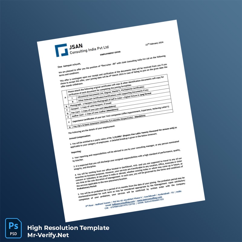 India JSAN Consulting India Pvt Ltd Employment Offer Letter Word and PDF Template