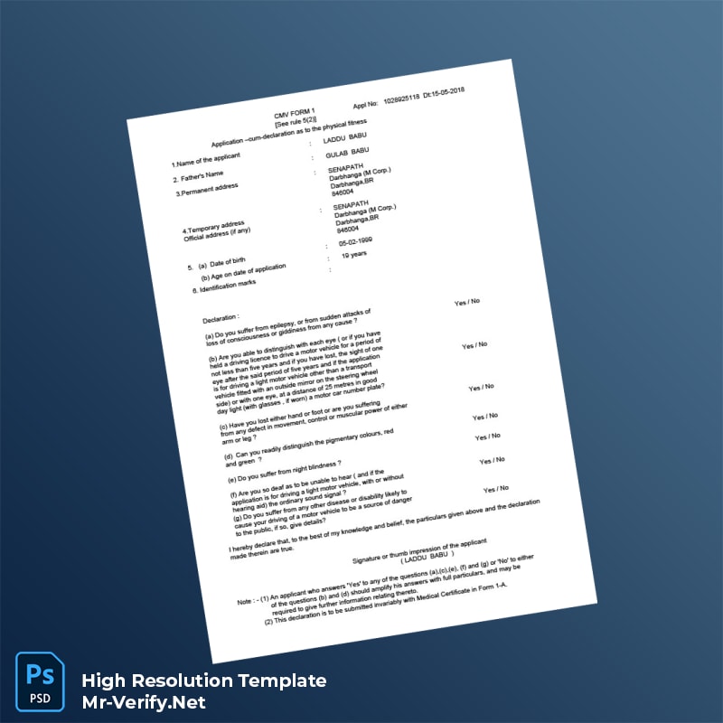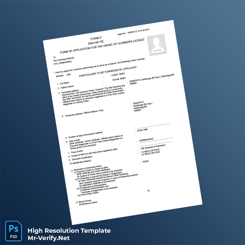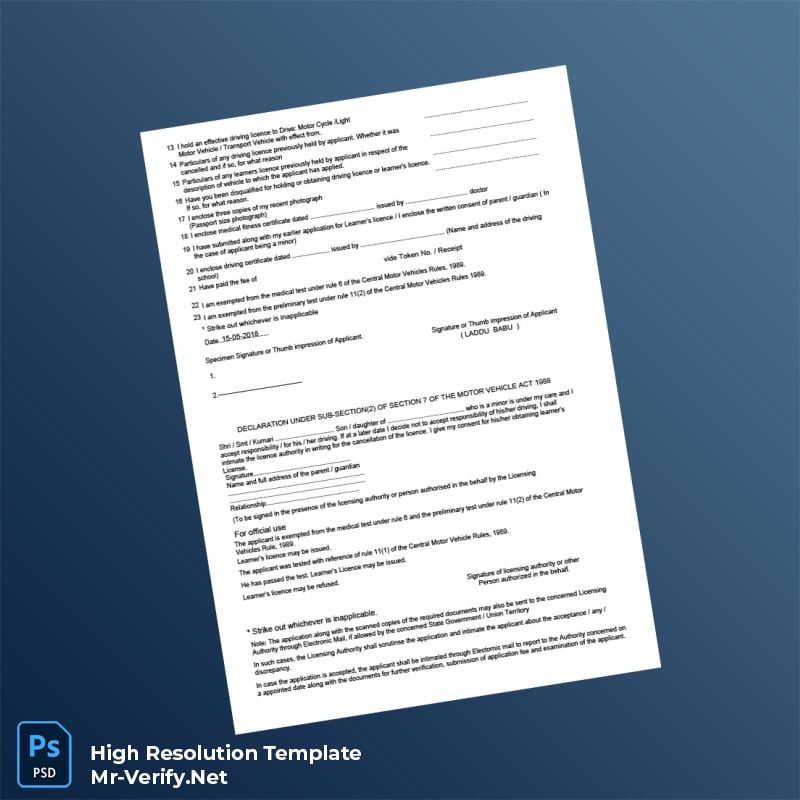 Designed with clarity and accuracy in mind, the template features a clean layout that ensures all information is neatly organized, enhancing readability and compliance with India Licensing Authority standards.