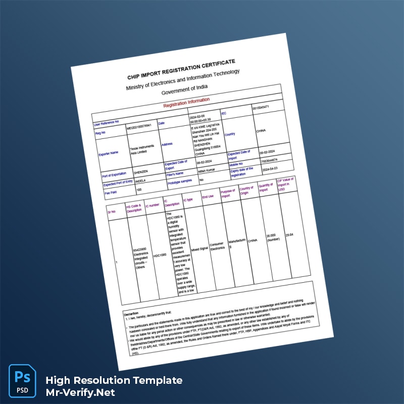 India Ministry of Electronics and Information Technology Chip Import Registration Certificate Word and PDF Template