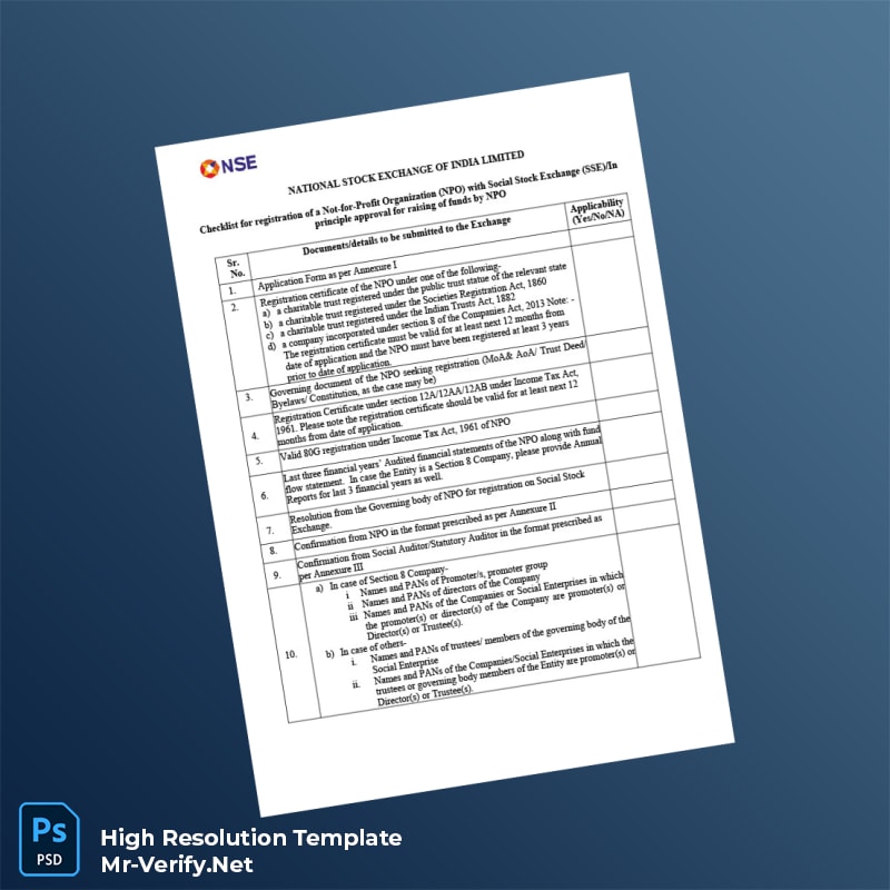 This high-quality template comes with several valuable features crafted to optimize efficiency: easily modify all document details including name, address, and key dates to reflect your specific not-for-profit entity; included fonts ensure consistent, professional presentation across Word and PDF formats; the checklist addresses all necessary registration criteria as per NSE guidelines to prevent submitting incomplete paperwork; instant download upon payment allows immediate access for urgent use; and the template’s layout is optimized for both digital editing and high-resolution professional printing.