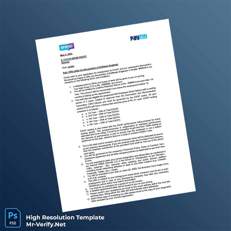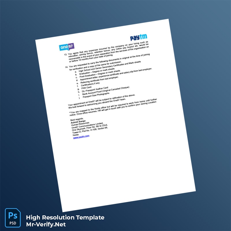The India One97 Communications Limited Employment Verification Letter Word and PDF Template is crafted to support global business professionals needing reliable and easy-to-use employment documentation. Its comprehensive design ensures effortless compliance with corporate standards and legal requirements.