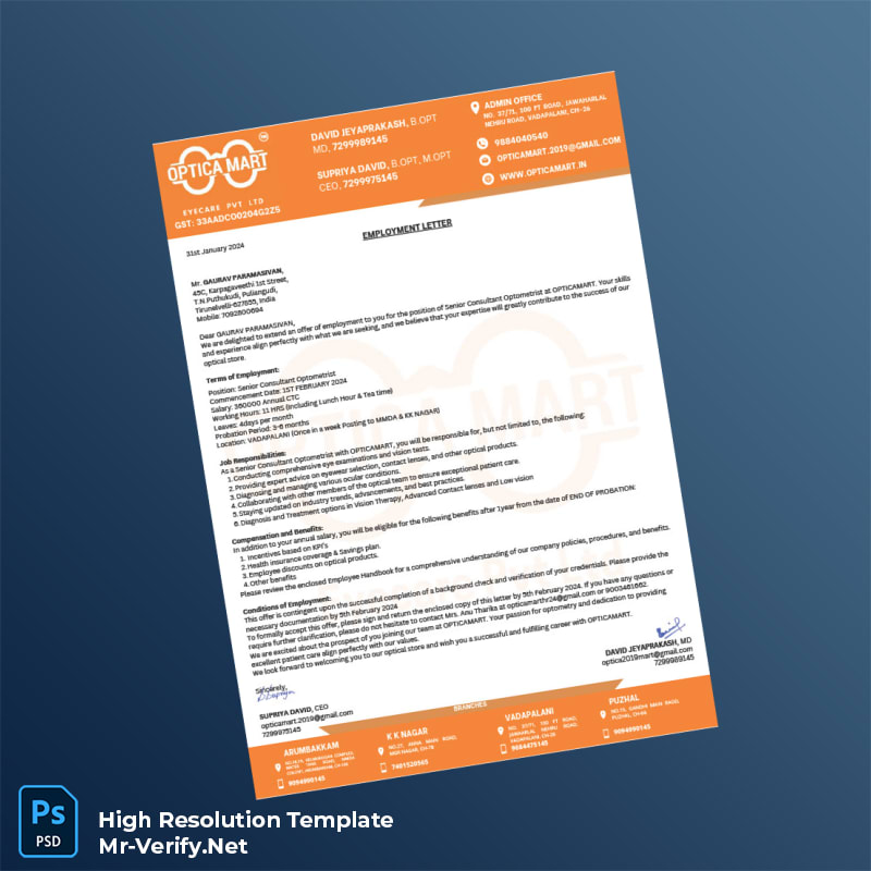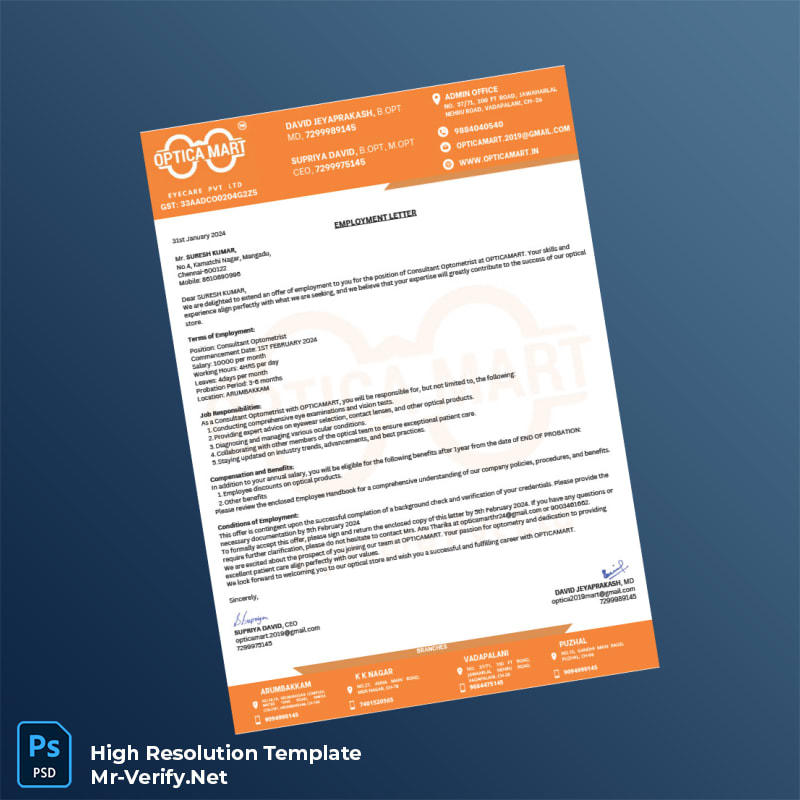 Don’t let documentation slow you down. Utilize the India Opticamart Employment Verification Letter Word and PDF Template to handle verification requests with confidence and professionalism. Make your employment verification process efficient, accurate, and seamless today.