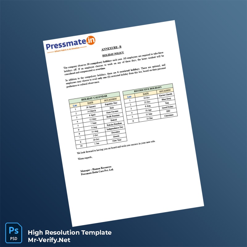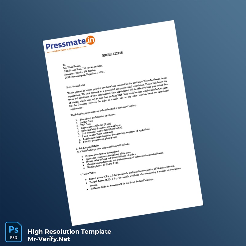 Don’t let paperwork slow you down. Equip your HR department with the India Pressmate Dotin Care Pvt Ltd Joining Letter Word and PDF Template to deliver precise, legally compliant, and visually professional employment verification documents. Purchase now and experience streamlined workflows that enhance your organization’s credibility and efficiency.