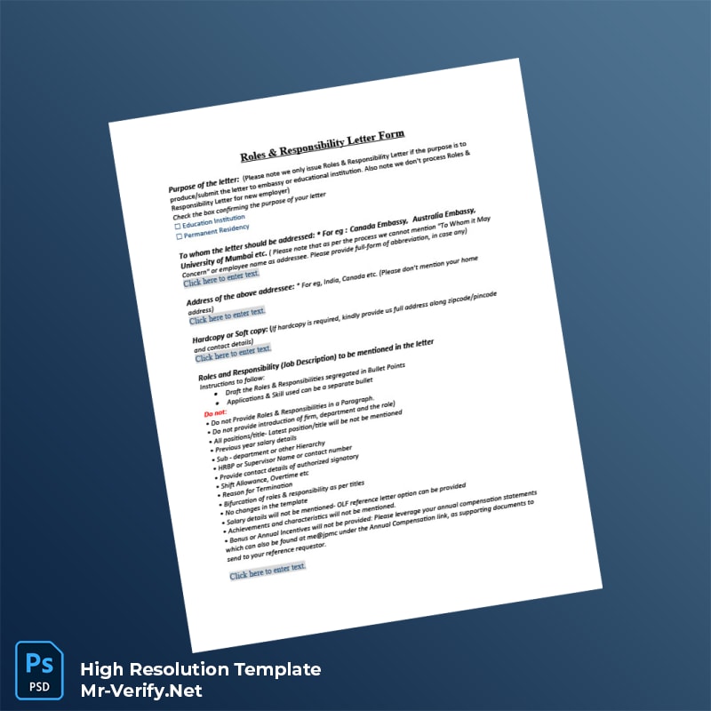 Effortlessly verify job details using our India Roles Responsibility Letter Form Word and PDF Template designed for professionals seeking a reliable and editable employment verification solution. Whether you’re HR personnel, a hiring manager, or an employee requiring proof of your role or job confirmation, this template simplifies the process, ensuring accuracy and professionalism in every document.