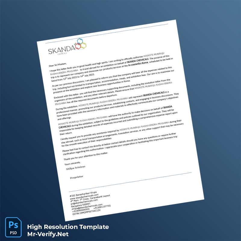 Don’t let paperwork delays hinder your professional activities. Invest in the India Skanda Chemicals Employment Verification Letter Word and PDF Template to secure a polished, accurate, and easy-to-use document solution. Download now and ensure your employment verification needs are handled swiftly and professionally.