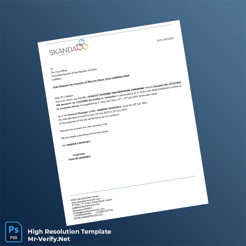 India Skanda Chemicals Employment Verification Letter Word and PDF Template: Your Professional Proof of Employment Solution
