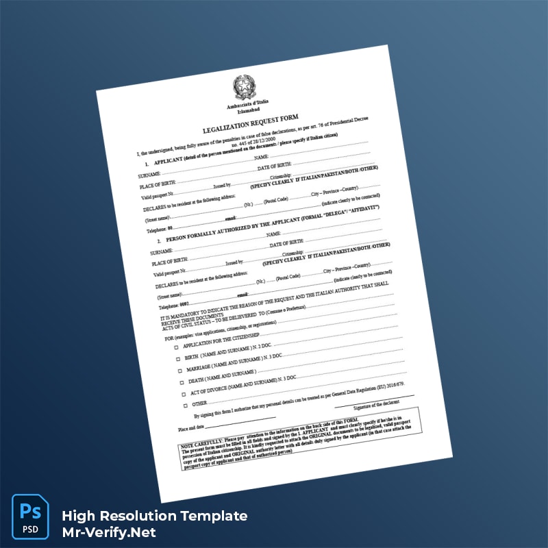The Italy Italian Embassy Legalization Request Form Word and PDF Template is designed to simplify the complex and often time-consuming task of document legalization. Whether you are a legal professional, business owner, or an individual needing official certification, this editable registration certificate template provides a reliable and efficient solution to prepare your documents accurately and promptly.