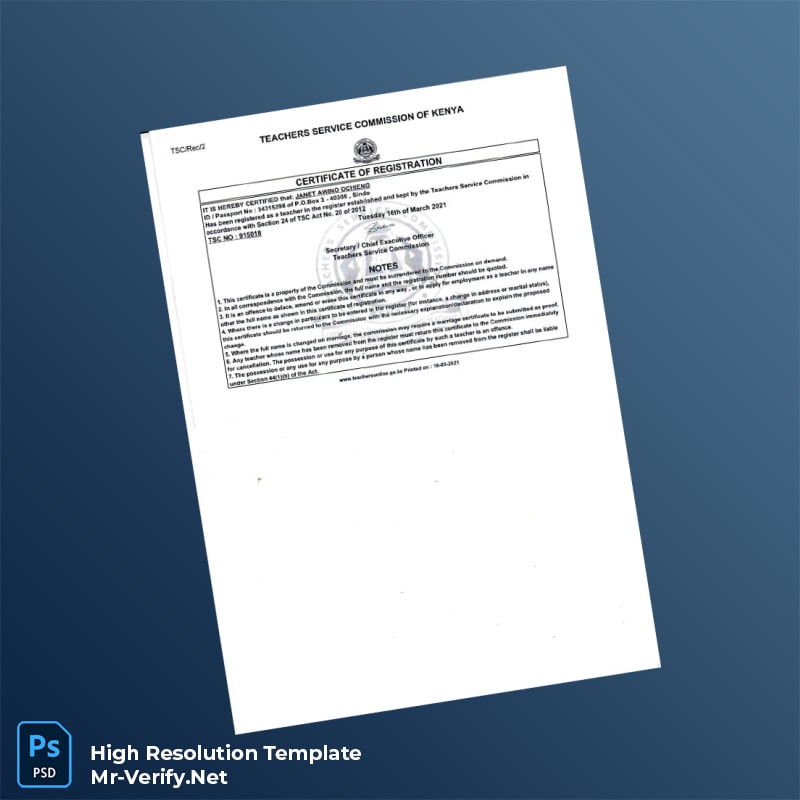 Invest in the Kenya Teachers Service Commission Certificate of Registration Word and PDF Template and experience a streamlined approach to your registration needs. Customize, print, and submit with confidence—your essential certificate is only a few clicks away. Enhance your administrative workflow and maintain uninterrupted professional status by obtaining your editable registration certificate now.