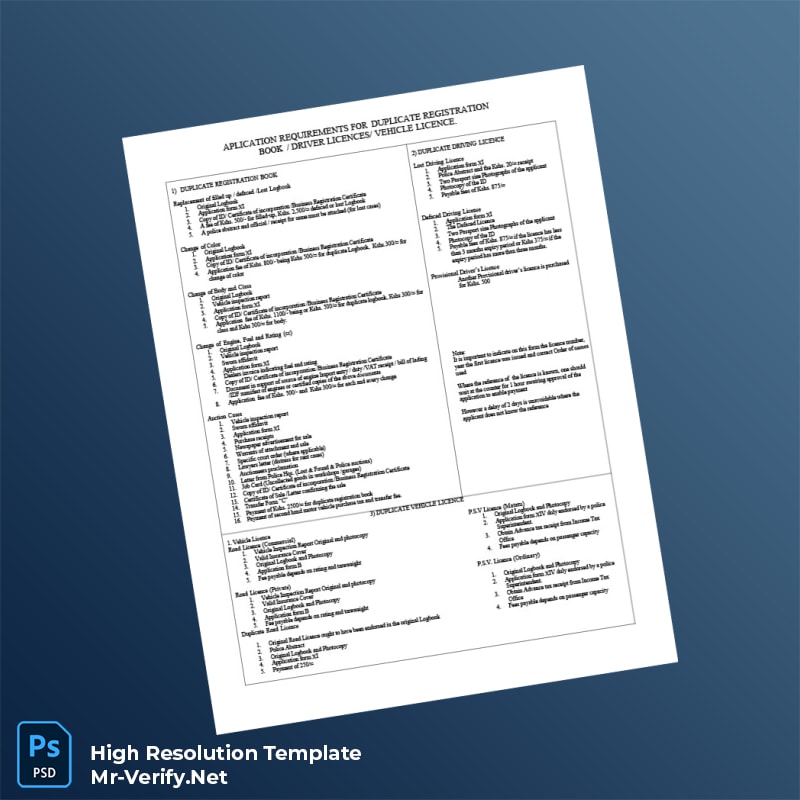 Don’t let lost or damaged documents disrupt your daily professional operations. Download the Kenya Traffic Authority Duplicate Registration Book or Drivers Licence Application Word and PDF Template today, and enjoy a professional-grade certificate template that guarantees quick, authoritative results. Simplify your vehicle documentation process with this invaluable tool designed for Kenya’s regulatory framework.