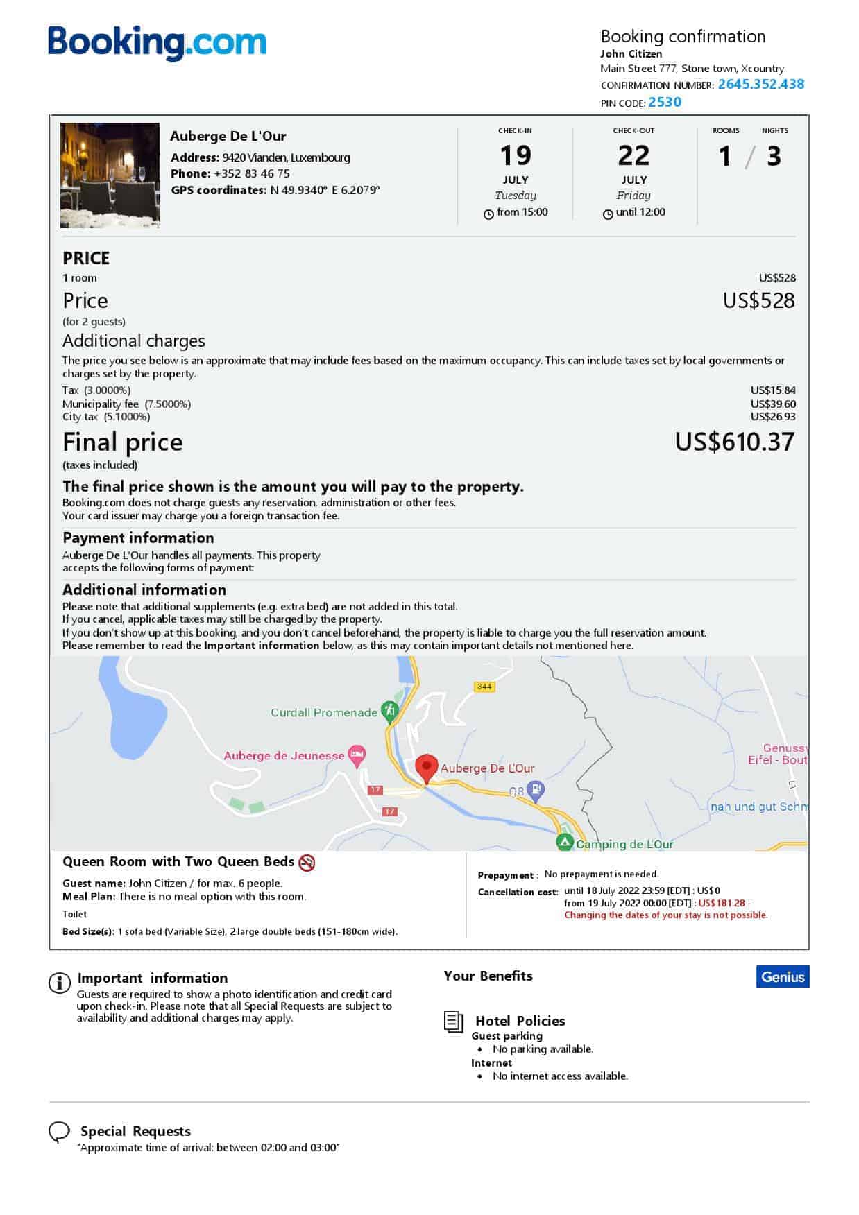 Are you in need of a hotel or Airbnb booking confirmation for your needs? Look no further! Mr. Verify’s editable templates are perfect for providing proof of accommodation and showing expenses, making the fake booking process even more authentic and reliable. Our templates come in both Word and PDF formats, and are available for almost all countries. With our Luxembourg country name fillable booking form templates, you can easily customize your booking confirmation to fit your specific needs, saving you time and hassle. And if you need any help with editing or construction works, our specialists are ready to assist you at affordable prices. Our support team is also available online to answer any questions you may have.