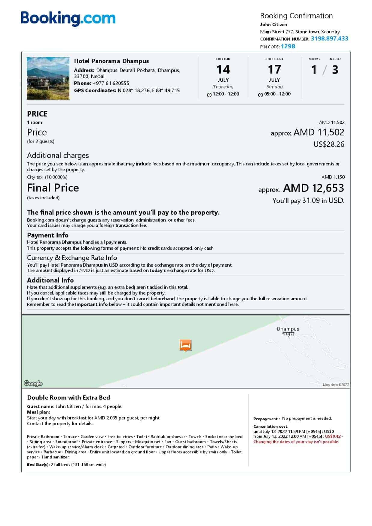 Are you in need of a hotel or Airbnb booking confirmation for your needs? Look no further! Mr. Verify’s editable templates are perfect for providing proof of accommodation and showing expenses, making the fake booking process even more authentic and reliable. Our templates come in both Word and PDF formats, and are available for almost all countries. With our Nepal country name fillable booking form templates, you can easily customize your booking confirmation to fit your specific needs, saving you time and hassle. And if you need any help with editing or construction works, our specialists are ready to assist you at affordable prices. Our support team is also available online to answer any questions you may have.