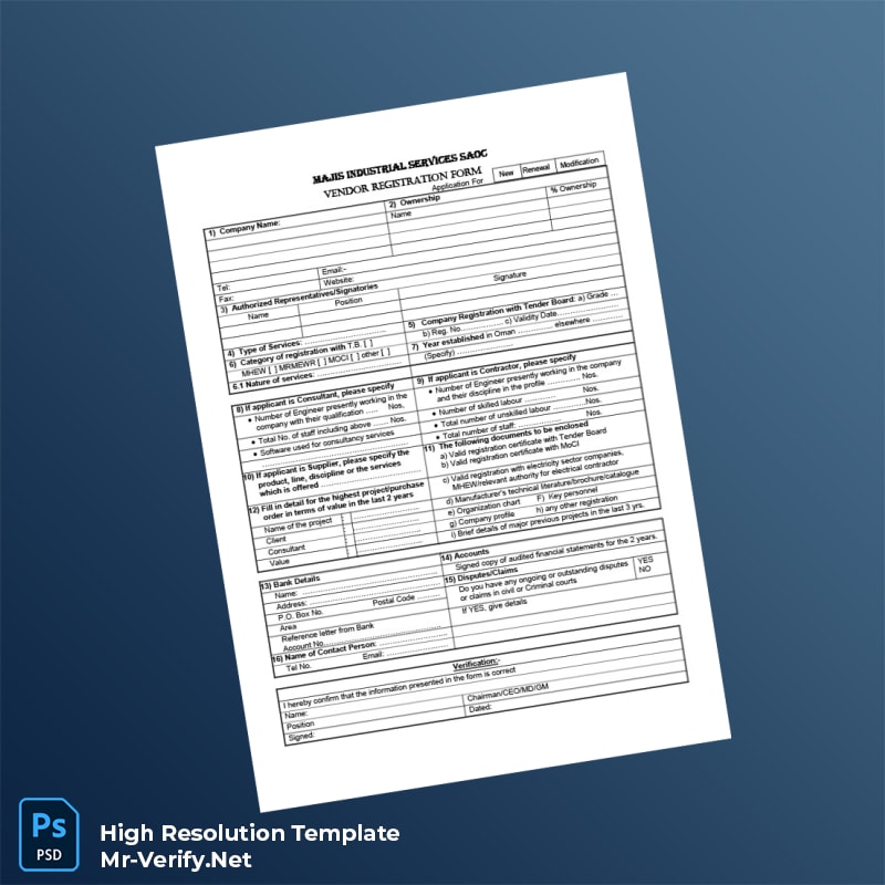 The Oman Majis Industrial Services SAOC Vendor Registration Form Word and PDF Template offers a professional and editable solution tailored for businesses and professionals seeking a seamless registration process. Designed to meet industry standards, this template ensures you can quickly and accurately complete vendor registration requirements without delay.