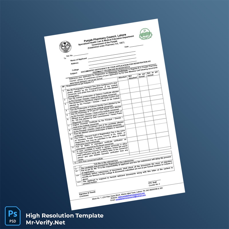 The Pakistan Punjab Pharmacy Council Registration Form Word and PDF Template is designed to streamline the process of obtaining your official pharmacy registration with ease and professionalism. This editable certificate template provides a seamless way to complete and submit your registration documents without hassle or delay.