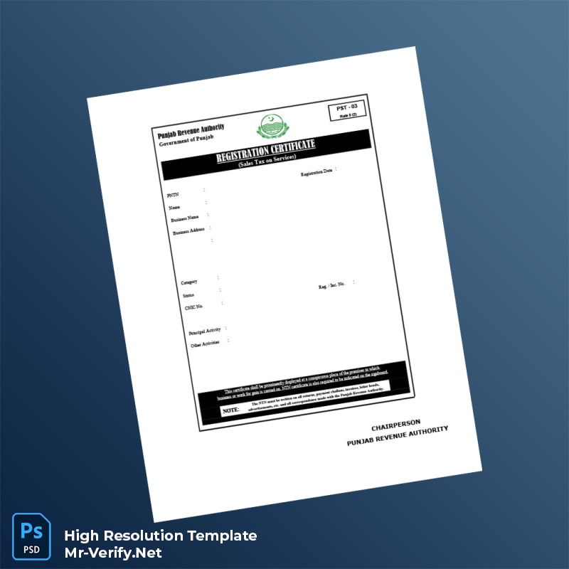 This Pakistan Punjab Revenue Authority Registration Certificate Word and PDF Template is the perfect tool for companies requiring certified, editable templates to maintain business legitimacy. Whether you need to replace a lost certificate, update details, or prepare new registration documents, this template delivers reliability and professionalism at your fingertips.